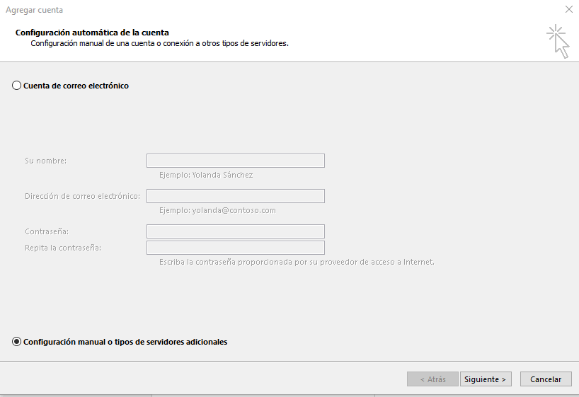 7. Configuramos Outlook ( Esta ventana aparece también si creamos una nueva cuenta desde MS Outlook )